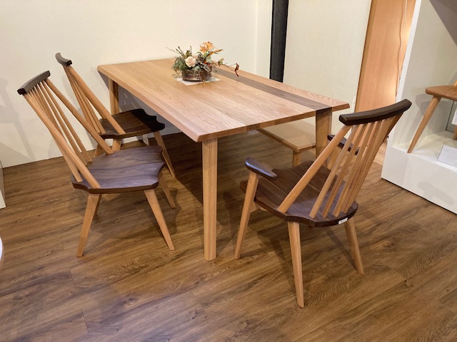 オーク材とウォールナット材を組み合わせた国産ダイニングセットです。材料、カラー、サイズ、天板の面形状等いろいなご要望にもお応えでき、アイテムも豊富なダイニングセットです。