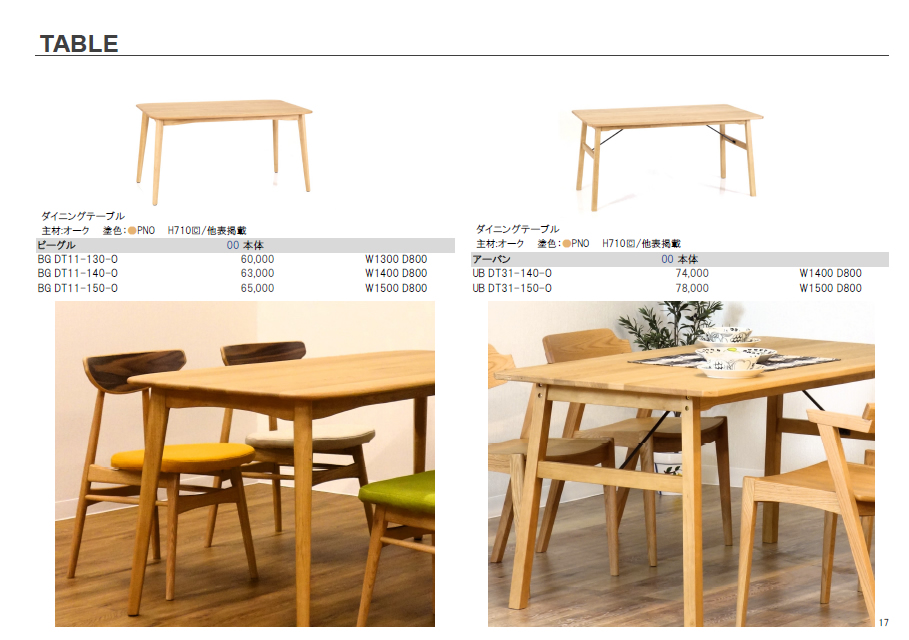 オーク材を使用した比較的値頃感のあるダイニングセットです。背当たりのいいビーグルチェアとサイズと天板形状(長方形・丸・半円等)を選べるフレックステーブルとの組合せとなっており、座面はカバーリング対応です。